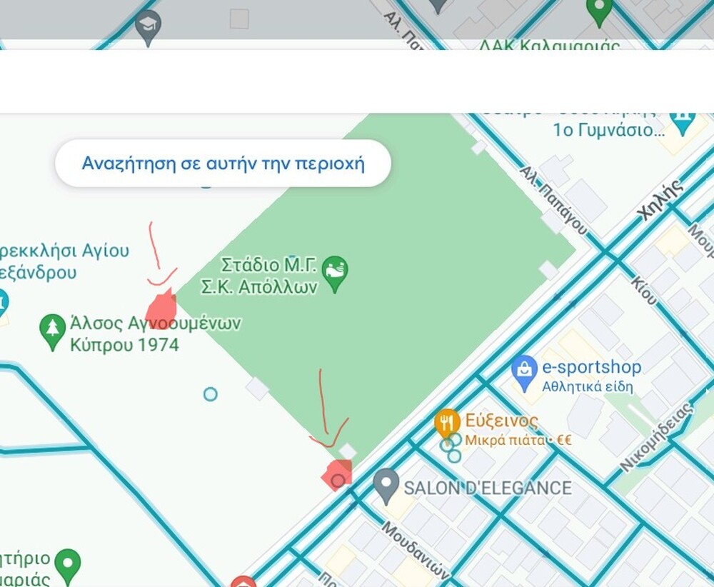 | Περιγραφή | Στο τέλος τού τοιχίου τού γηπέδου τού Απόλλωνα, στην οδό Χιλής (στο ύψος με την Μουδανίων), αν και έγινε κοπή χόρτων, σε ένα σημείο και συγκεκριμένα στην αρχή τού μονοπατιού που οδηγεί μέσα από το πρώην πάρκινγκ, στο πίσω μέρος του γηπέδου, υπάρχουν πολλά και πολύ ψηλά ξερόχορτα. Αν και καθαρίστηκε ολόκληρος ο χώρος τού πρώην πάρκινγκ (πλέον άλσος), κατά έναν παράδοξο τρόπο, αφέθηκαν επίσης ακούρευτα, μεγάλα χόρτα, λίγα μέτρα πιο μετά από την αρχή τού μονοπατιού και συγκεκριμένα στο ύψος λίγο πριν το πίσω μέρος τού γηπέδου. (Παραθέτω φωτογραφίες με τα σημεία). |