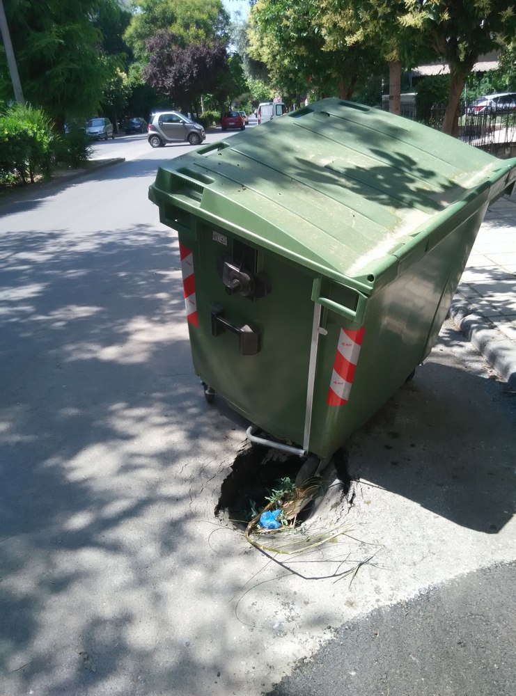 Στην οδό Κερασούντος 69 έχει μεγάλη λακκούβα και οι κάτοικοι έβαλαν τον κάδο για να μήν γίνει ατυχήμα!!