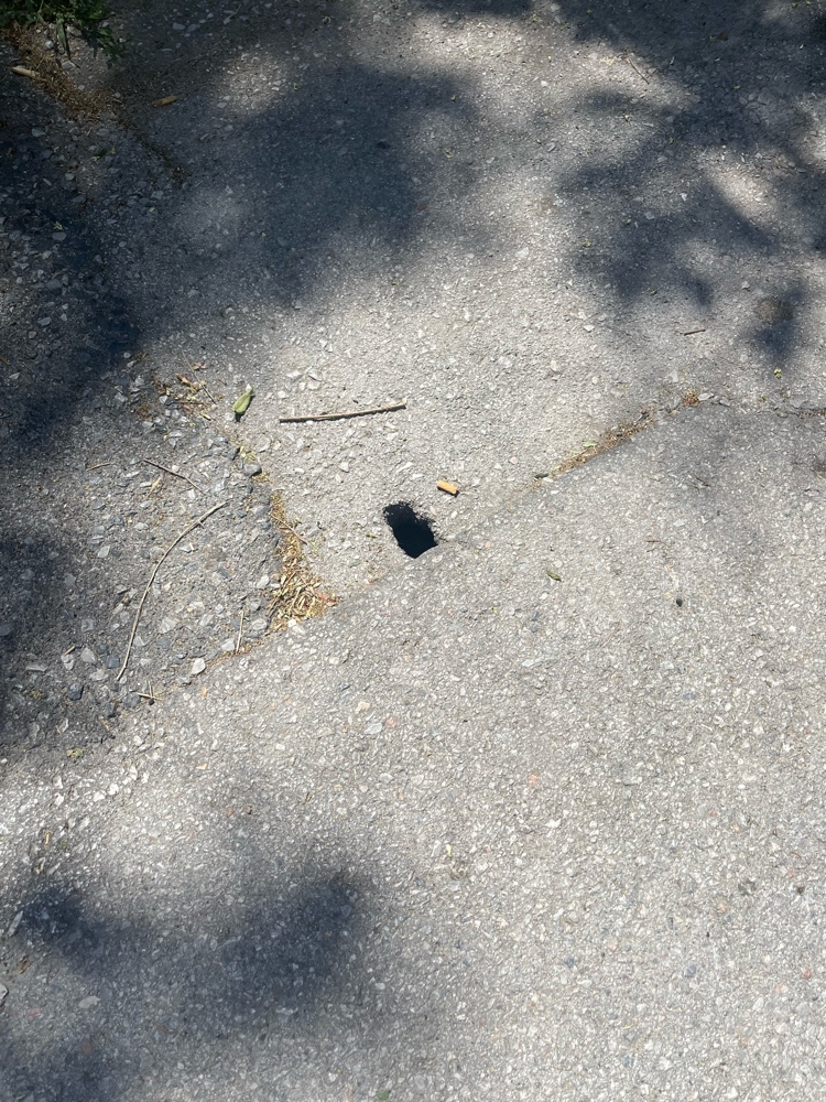 Πριν λίγες ημέρες εντόπισα μία τρύπα στο οδόστρωμα και μετά από μια δυο μέρες εμφανίστηκε και μία δεύτερη τρύπα που σημαίνει ότι είναι πολύ επικίνδυνο διότι περνάνε αυτοκίνητα συνέχεια. Χρήζει επισκευής άμεσα.