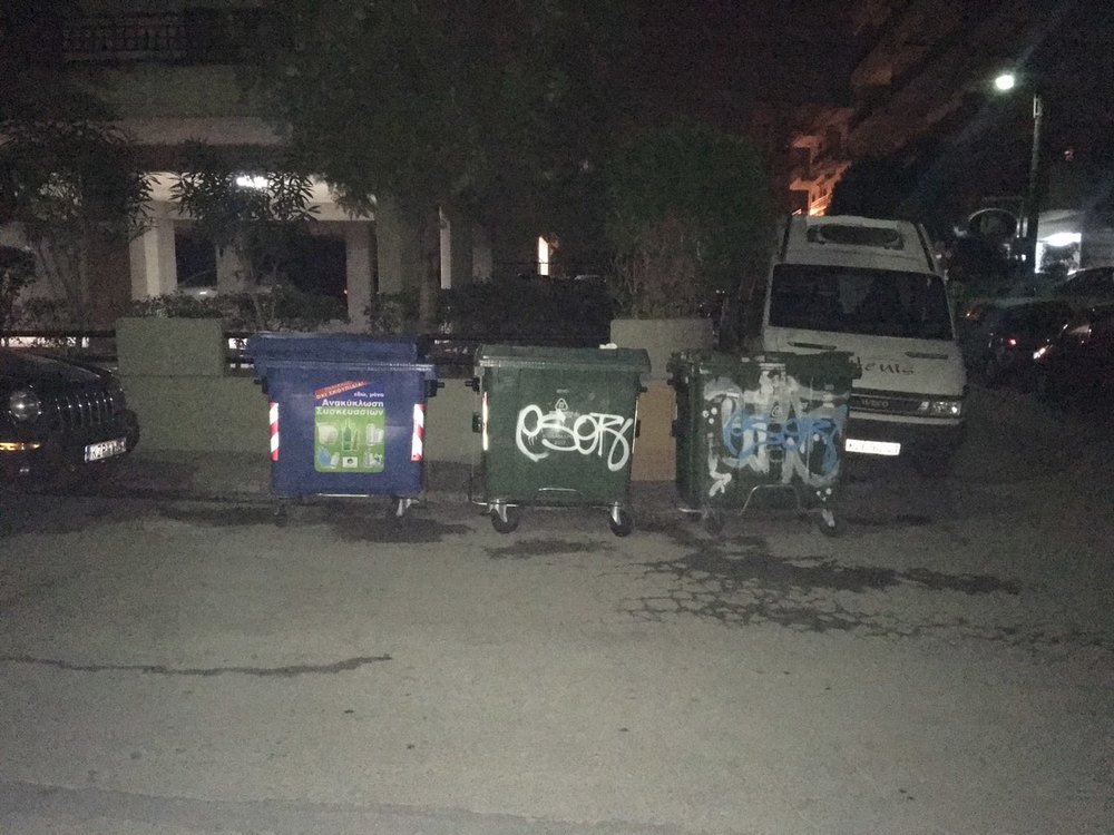 | Περιγραφή | Στη συμβολή των οδών Μεσολογγίου και Φλέμινγκ υπάρχει κάδος ανακύκλωσης με σπασμένο καπάκι. |