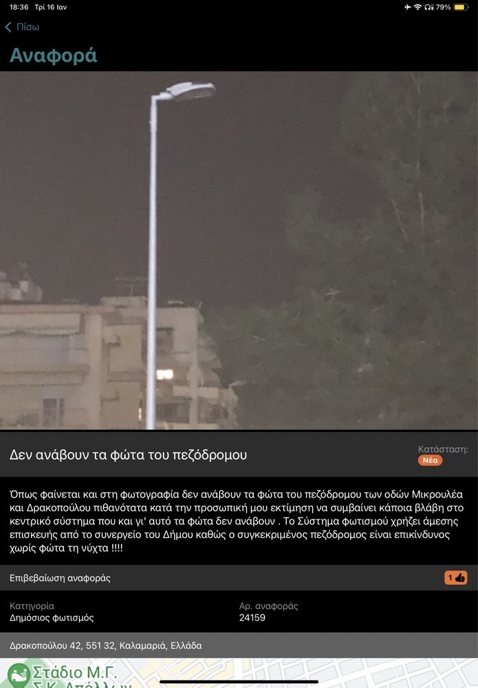 | Περιγραφή | Όπως φαίνεται και στη φωτογραφία ο φωτισμός του πεζόδρομου των οδών Δρακόπουλού και Μικρουλέα δεν λειτουργεί με αποτέλεσμα να είναι ο πεζόδρομος σκοτεινός και επικίνδυνος . Είναι ντροπή Ενετοί 2024 παρότι έχουν γίνει κι άλλες καταγγελίες για τον ίδιο θέμα να παραμείνει ο πεζόδρομος στην ίδια κατάσταση για πολλές μέρες . Ευελπιστώ και ελπίζω στην άμεση επισκευή του προβλήματος από το συνεργείο του Δήμου !!! |