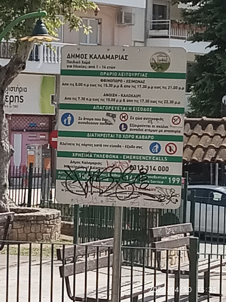 Καθαρισμός της πληροφοριακής πινακίδας από γκράφιτι στην παιδική χαρά στην πλατεία Ύδρας επί της οδού Σμύρνης.