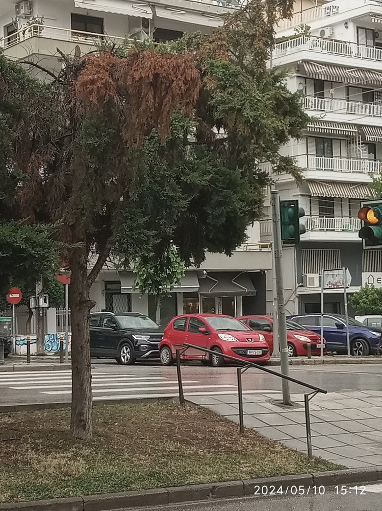 Στην διαχωριστική νησίδα να κοπή το ξερό κλαδί του δέντρου που επεκτείνεται προς το οδόστρωμα επί της Χηλής απέναντι από την στάση του λεωφορείου.