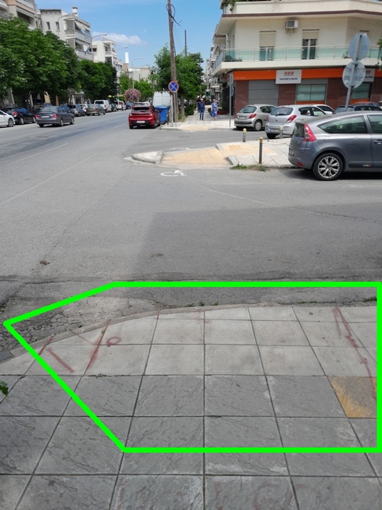 | Περιγραφή | Όπως φαίνεται στην συνημμένη φωτογραφία, η ράμπα στην γωνία των οδών Εθν. Αντιστάσεως 99 και Φιλαδέλφειας δεν έχει υλοποιηθεί καθόλου σύμφωνα με την σελίδα 32838 του ΦΕΚ2302β'/2013, αλλά και το ΣΧ.12α της σελίδας 62827 του ΦΕΚ6213β'/2022, παρότι έχει σημειωθεί με σπρέι.