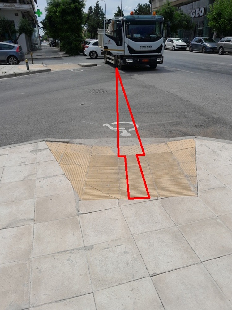 | Περιγραφή | Όπως φαίνεται στην συνημμένη φωτογραφία, η ράμπα στην γωνία των οδών Εθν. Αντιστάσεως 97 και Ζαρίφη έχει υλοποιηθεί λανθασμένα σύμφωνα με την σελίδα 32838 του ΦΕΚ2302β'/2013, αλλά και το ΣΧ.12α της σελίδας 62827 του ΦΕΚ6213β'/2022 και ταυτόχρονα η κατεύθυνσή της οδηγεί (επικίνδυνα) εντός του οδοστρώματος της οδού Εθν. Αντιστάσεως και όχι στην απέναντι από αυτήν ράμπα, παραβιάζοντας τις ισχύουσες προδιαγραφές.