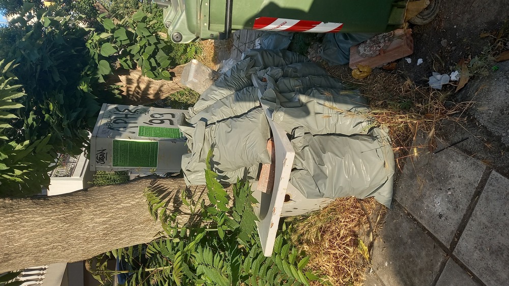 | Περιγραφή | Δίπλα στον πράσινο κάδο υπάρχουν μπάζα από ανακαινίσεις. |