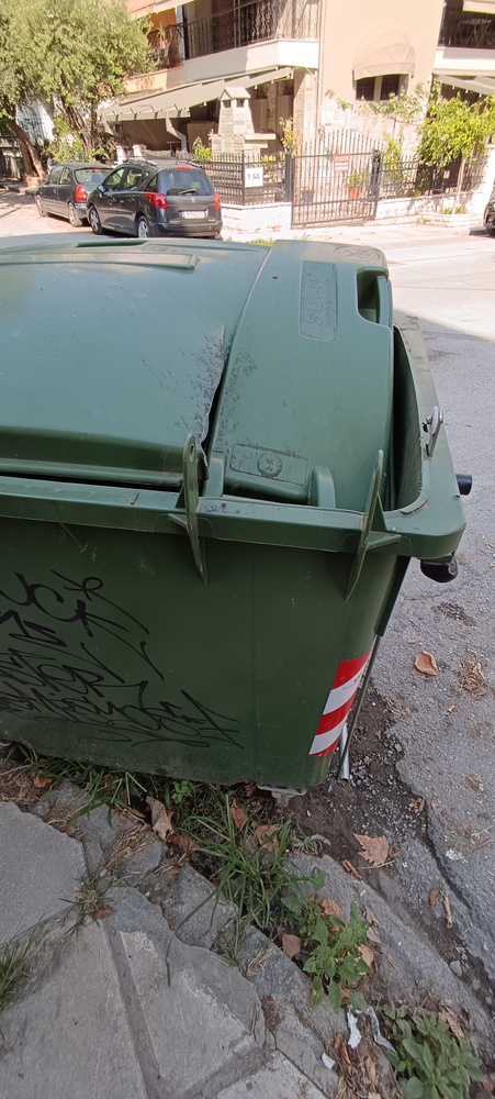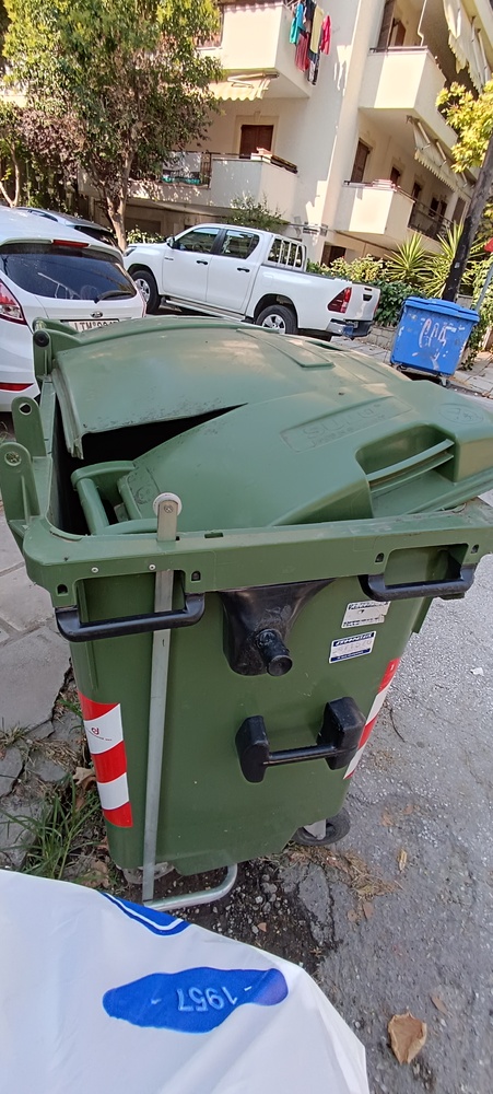 Έχει σπάσει το καπάκι στον πράσινο κάδο απορριμμάτων με αποτέλεσμα να μυρίζει άσχημα και να μπαινοβγαίνουν οι γάτες .