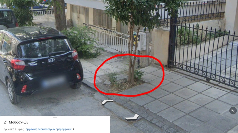 Εξαιτίας τού εικονιζόμενου δέντρου, έχουν αποκολληθεί, οι πλάκες τού πεζοδρομίου. Το πεζοδρόμιο ήταν και παραμένει ανισόπεδο. Με την ευκαιρία αυτή, παρακαλώ να διορθωθεί.