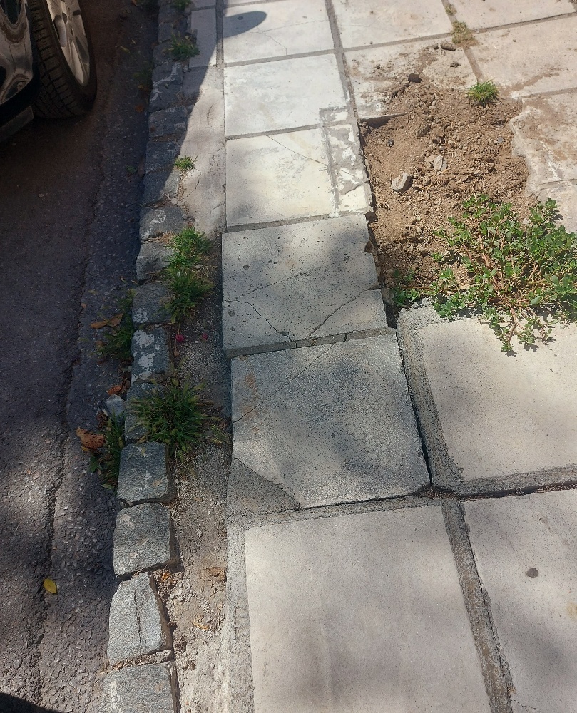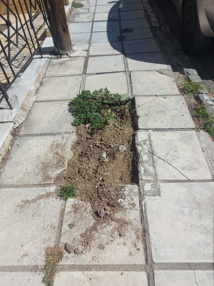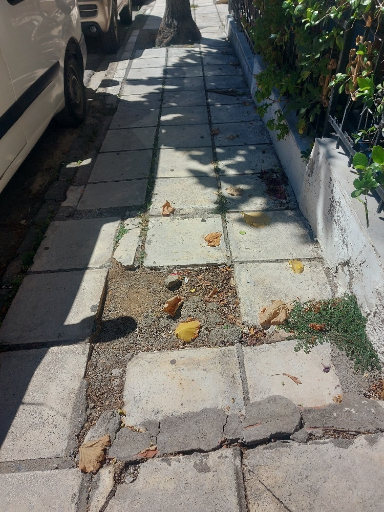 Μετά από κοψιμο δέντρων δεν τοποθετήθηκαν πλακίδια στο πεζοδρόμιο. Με αποτέλεσμα να δημιουργηθεί κενό και αστάθεια στα υπαρχοντα πλακίδια πεζοδρομίου. Γενικότερα η κατάσταση του πεζοδρομίου επί της Κολοτούρου ειναι κακιστη.