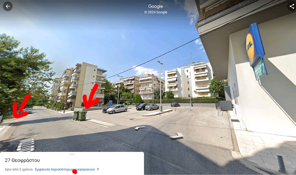 Πίσω από τους πράσινους κάδους, μπροστά στο πάρκινγκ τού Lidl, είναι γεμάτο ογκώδη αντικείμενα. Έπιπλα, ξύλα κλπ. Ακριβώς απέναντι από τους κάδους, στην γωνία από το στενάκι, υπάρχουν σπασμένα κλαδιά.
