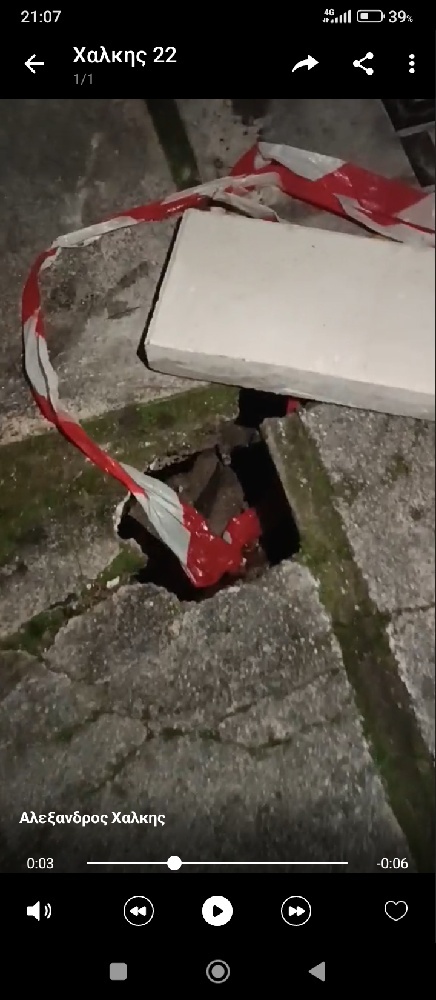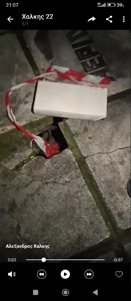 | Περιγραφή | Εχει ανοίξει τρυπα, υπάρχει μεγάλο κενό κάτω από την πλάκα πεζοδρομίου.α)Κίνδυνος να σκονταψει και να πέσει κάποιος β) ίσως και να υποχωρήσει όλη η πλάκα αν πατήσει κάποιος επάνω της,λόγω του κενού από κάτω |