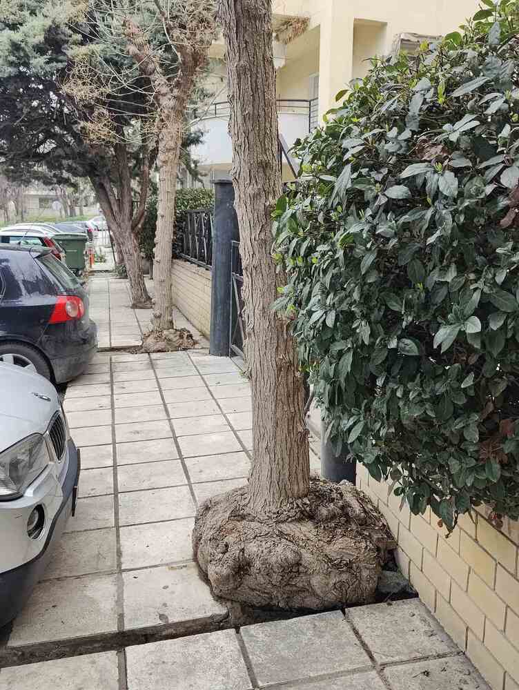 Στο πεζοδρόμιο, της οδού Εφέσσου 19 (συγκρότημα Oasis). Τα 4 δέντρα των οποίων οι ρίζες έχουν μεγαλώσει υπερβολικά πάνω από το ύψος του πεζοδρομίου και αυτό έχει σαν αποτέλεσμα να πιέζουν την περίφραξη του συγκροτήματος με αποτέλεσμα να πάρει κλίση προς την πλευρά του συγκροτήματος Oasis σε τέτοιο βαθμό που είναι έτοιμη να σπάσει σε κομμάτια . Αυτό είναι πολύ επικίνδυνο για ασφαλή διέλευση των πεζών. Καθώς επίσης είναι αδύνατη η διέλευση σε μητέρες με παιδιά σε καρότσι, πολύ περισσότερο για διέλευση ατόμων ΑΜΕΑ.