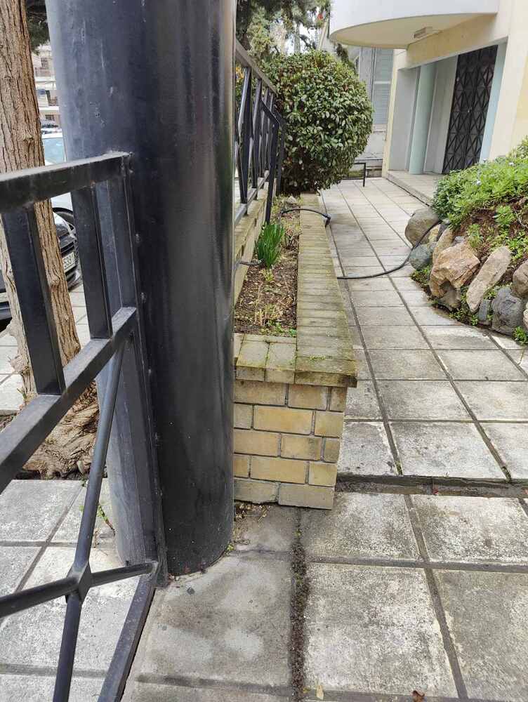 5. Καταγράφηκε ασυνέχεια στην πρόσβαση των χρηστών σημειακά λόγω εξαγωγής δύο πλακών πεζοδρομίου αλλά και λόγω κατασκευασμένης ανοικτής οριζόντιας απορροής των όμβριων υδάτων της οικοδομής.