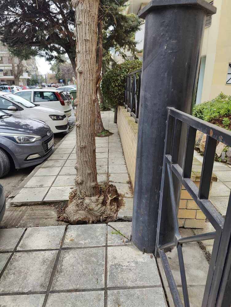 4. Η χωροθέτηση των δέντρων , η ανάπτυξη του ριζικού τους συστήματος καθώς και το μέγεθος τους, αποτελούν αποτρεπτικό παράγοντα στη χρήση του πεζοδρομίου από ΑΜΕΑ και κάνουν δυσχερή τη διέλευση των πεζών.