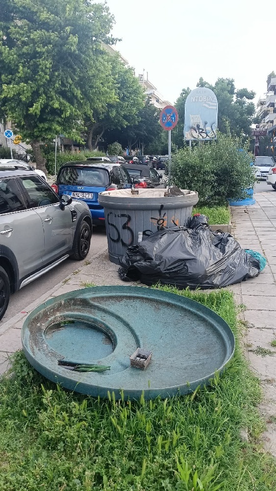| Περιγραφή | Το καπάκι του πράσινου κάδου είναι πεταμένο δίπλα με τους περίοικους να αφήνουν τα σκουπίδια εκτός |