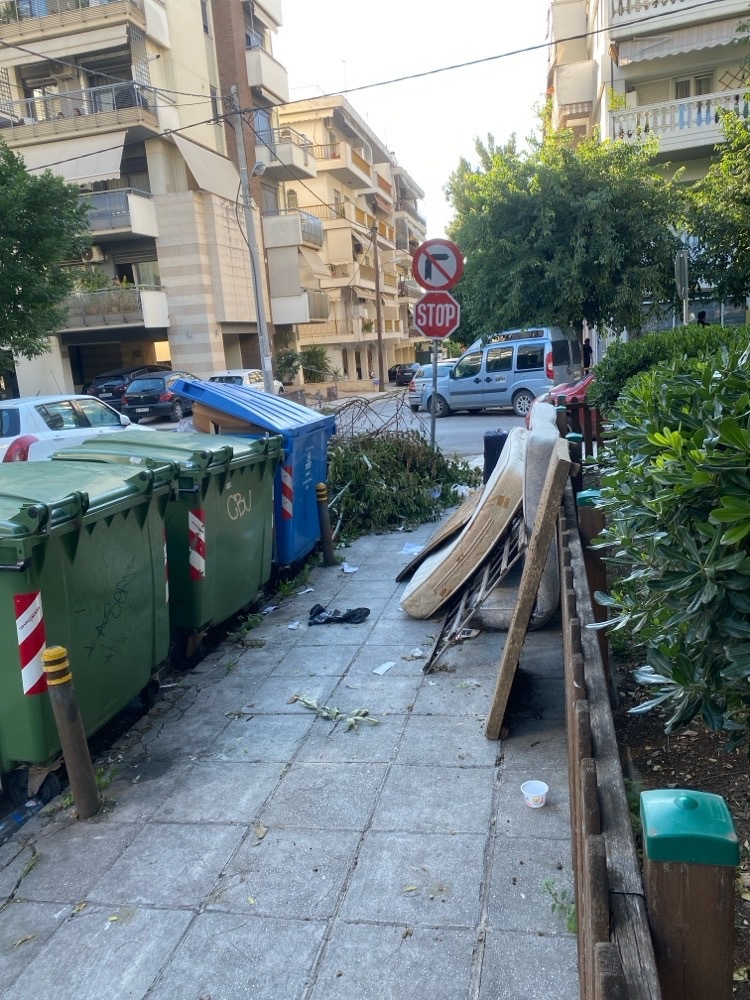 | Περιγραφή | Στρώματα έπιπλα και κλαδιά στο πεζοδρόμιο. εστία μόλυνσης. |