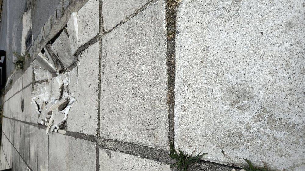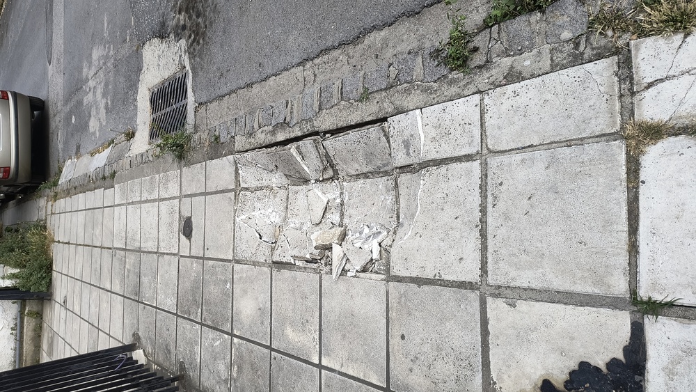 Συγκεκριμένα, έξι (6) πλάκες του πεζοδρομίου έχουν σπάσει και έχουν υποχωρήσει στο έδαφος κατά περίπου 15-20 εκατοστά, με αποτέλεσμα να υπάρχει αυξημένος κίνδυνος πτώσης και τραυματισμού για τους διερχόμενους πολίτες, ειδικότερα το βράδυ που η ορατότητα είναι περισορισμένη. Από την έκταση και τη φύση της φθοράς, πιθανολογείται ότι προκλήθηκε από τη διέλευση βαρέος οχήματος, πιθανόν φορτηγού, καθώς φαίνεται να έχει ασκηθεί σημαντικό βάρος στο σημείο.
