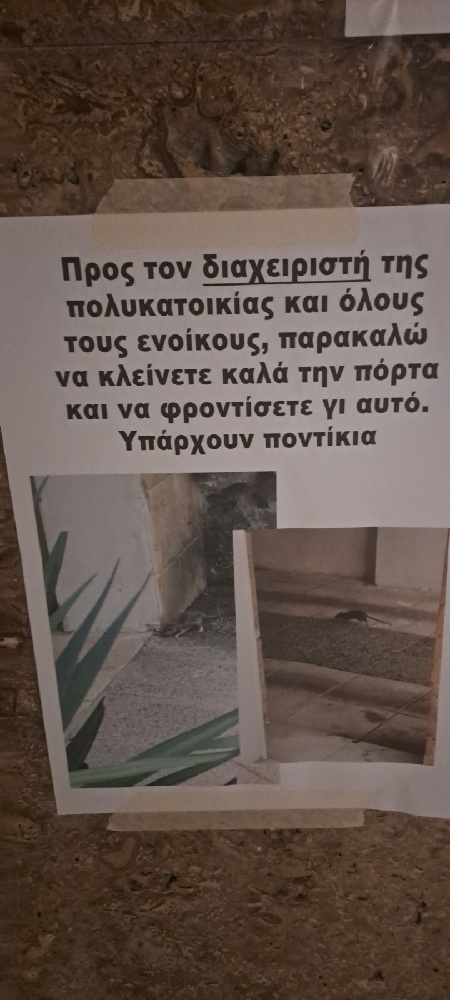 | Περιγραφή | μεγαλη Αύξηση πληθυσμού ποντικιών στην Κομνηνών 12 και στις γύρω οικοδομές-ειναι αναγκαίο να ψεκαστουν απολυμανθουν φρεάτια κλπ και να γίνουν μυοκτονιες - μεγάλο πρόβλημα και κίνδυνος για τη δημόσια υγεια |
