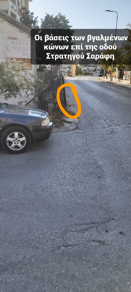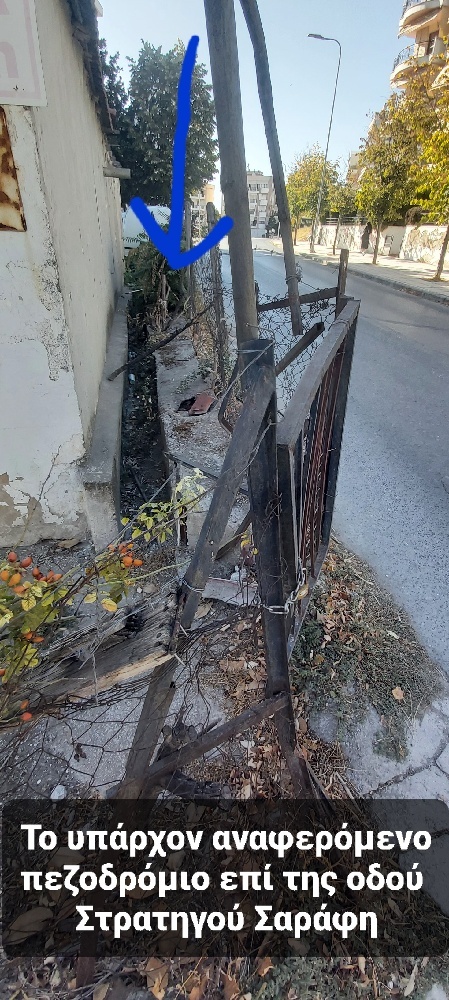 Από την άλλη αντιλαμβάνομαι ότι είναι πολύ δύσκολο θέμα σε γραφειοκρατικό ζήτημα και δε ζητώ το πεζοδρόμιο να είναι τόσο ευρύ όπως στην υπόλοιπη περιοχή. Απαιτούνται απαλλοτροιώσεις, βέβαια υπάρχει ήδη ένα μικρό πεζοδρόμιο επί της Στρατηγού Σαράφη που είναι περιφραγμένο και γεμάτο βλάστηση, που αν είναι προσβάσιμο, θα είναι καλύτερα για τους πεζούς. Έτσι προφανώς δε θα απαιτηθεί απαλλοτροίωση σε όλο το οίκημα, αλλά στον περιβάλλοντα χώρο. Στην Στρατηγού Σαράφη υπήρχαν κώνοι ενδεικτικοί για τα αυτοκίνητα, ωστόσο πλέον κόπηκαν και δε διακρίνονται. Επιχειρήστε έστω μία ελάχιστη παρέμβαση σε μία περιοχή που είναι αρκετά ποιοτική, πρόκειται να αναβαθμιστεί περαιτέρω με το Μετρό και δεν τής πρέπει τέτοια εικόνα.