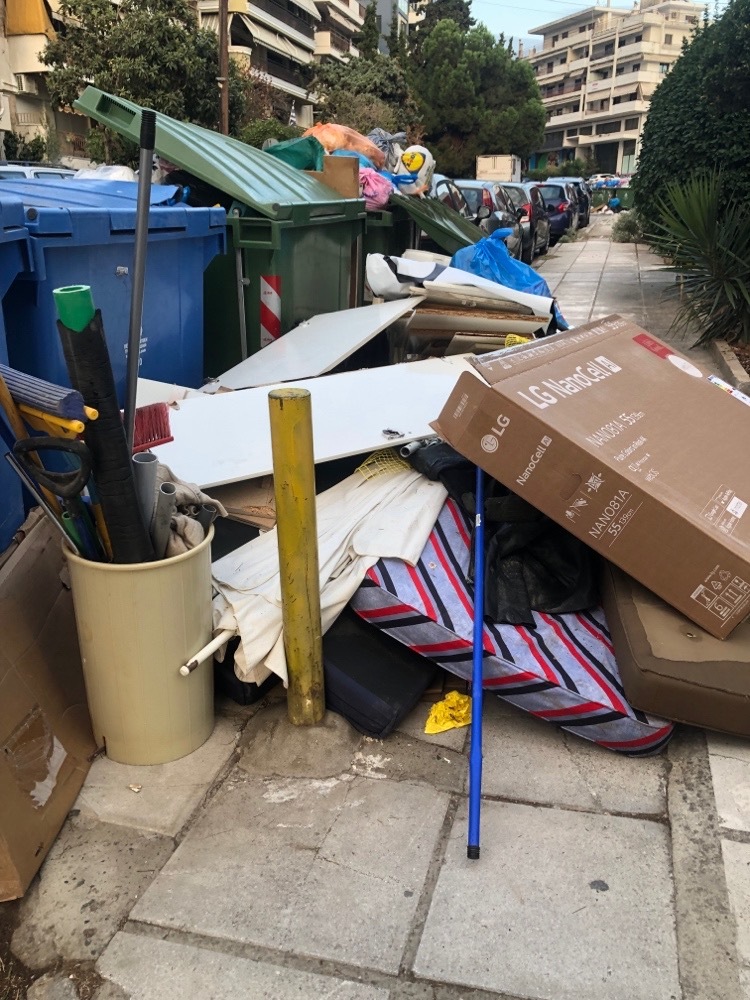 Ογκωδη αντικειμενα και σκουπιδια διπλα σε παιδικες χαρες και πεζοδρομια Θερμαικου γωνια με Γρηγοριου Ε μεχρι και μεσα στο Παρκο των Ροδων