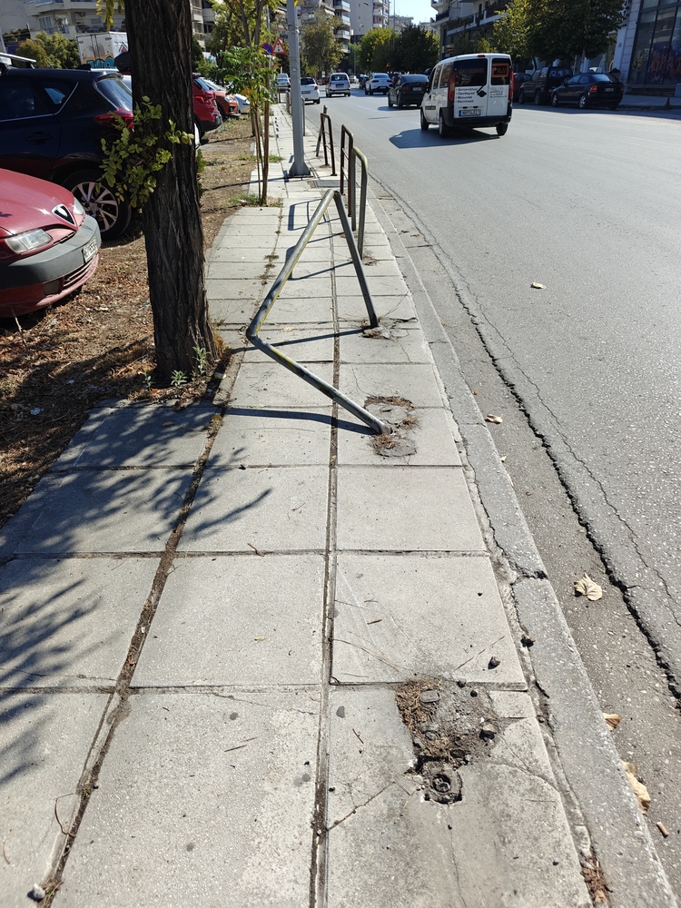 Υπάρχει κάγκελο πεζοδρομίου (στην αριστερη πλευρά του δρόμου) το οποίο προφανώς κάποιο αμάξι το χτύπησε και στράβωσε τελειώς με αποτέλεσμα το πεζοδρόμιο να ειναι απροσπέλαστο απο πεζους - αμαξίδια. Κάποιος ή να το ξεστραβώσει ή να το κόψει.