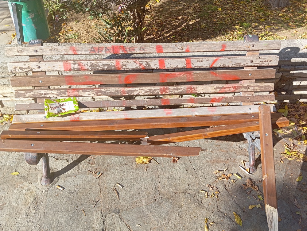 Τα γνωστά τσογλανακια ξαναχτύπησαν! Πέρα από το ότι κάθε βράδυ μαζεύονται κ βρωμιζουν τον τόπο με ότι τρώνε κ ότι πίνουν βγάζουν τη μανία της τεστοστερόνης τους σπάζοντας κ ριμαζοντας τα παγκάκια! Ως πότε πια θα ανεχόμαστε κ θα πληρώνουμε για πάρτη τους?