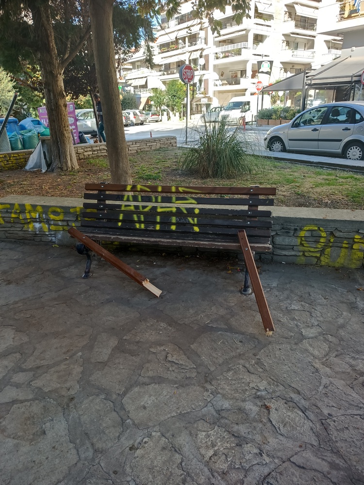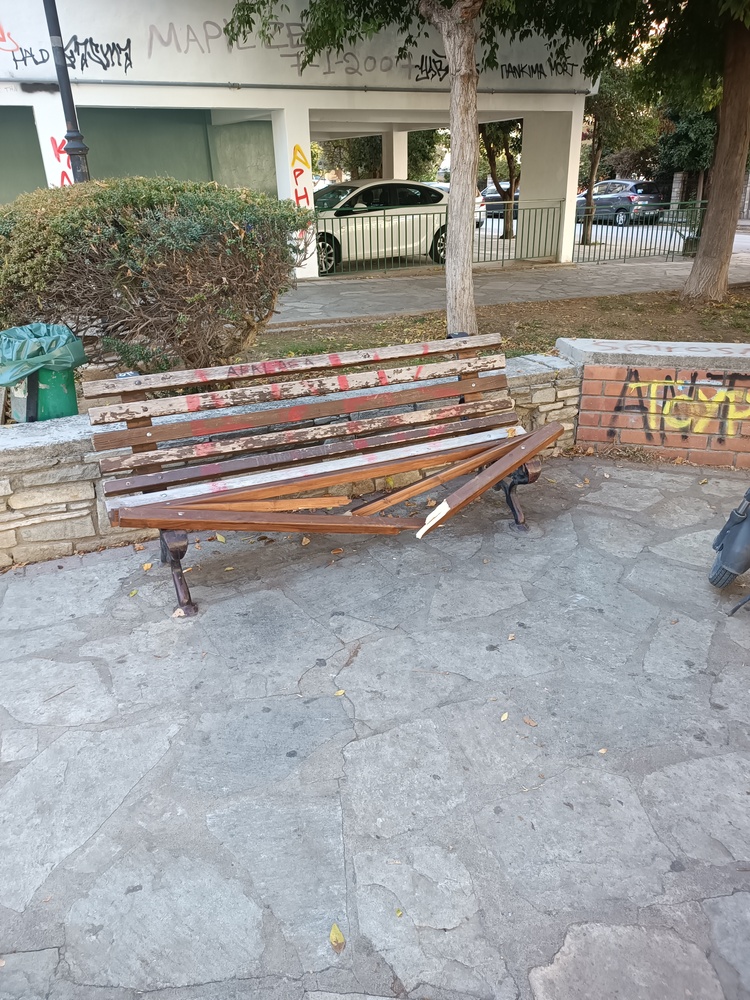 Στο πάρκο-παιδική χαρά στη συμβολή των οδών Καυκάσου και Βουλγαροκτόνου υπάρχουν ΔΥΟ παγκάκια κατεστραμμένα
