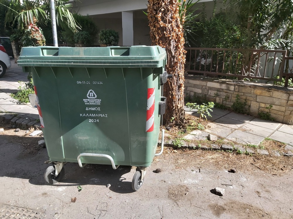 Παρακαλούμε για την οριοθέτηση της θέσης του κάδου σκουπιδιών π.χ. με πλαστικά κολονάκια (όπως έχει γίνει και στην απέναντι οικοδομή). Ο κάδος σκουπιδιών μετακινείται από από οδηγούς οχημάτων με σκοπό την στάθμευση και διαρκώς βρίσκεται σε διαφορετική θέση.