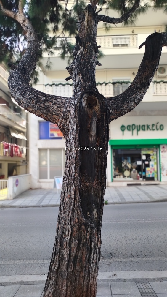 Στην Αδαμαντίου Κοραή 05 το πεύκο έχει επικίνδυνη κλίση τα κλαδιά του δέντρου επεκτείνονται στο δρόμο το ριζικό σύστημα του δέντρου έχει σηκώσει από την πίσω πλευρά τις πλάκες του πεζοδρομίου καθώς και ο κορμός έχει σχισμές να γίνει κοπή.
