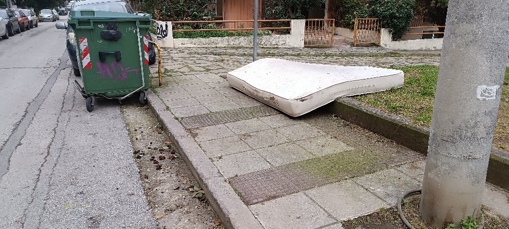 | Περιγραφή | παρατημένο στρώμα κρεβατιού δίπλα σε κάδο |
