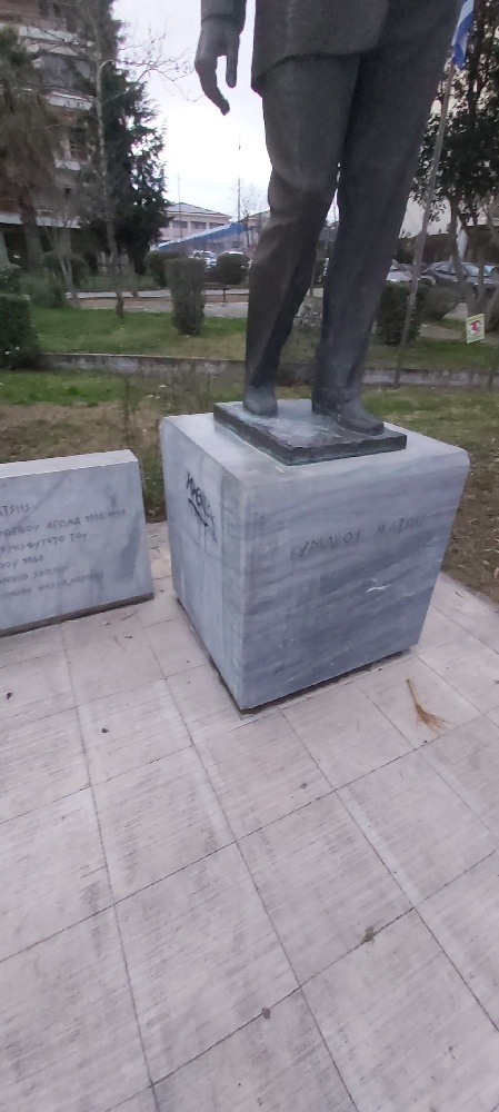 | Περιγραφή | Χαίρετε. Το άγαλμα του Κυριάκου Μάτση στην ομώνυμη πλατεία δίπλα από την παιδική χαρά Παντειχίου και κοντά στο 3ο Γυμνάσιο στην Νέα Κρήνη φέρει γραψίματα από βαφή και μολύβι. Δεν πρέπει τέτοια μοίρα σε άγαλμα ενός τόσο σπουδαίου και γενναίου ήρωα. Παρακαλώ να καθαριστεί όσο το δυνατόν πιο σύντομα. |