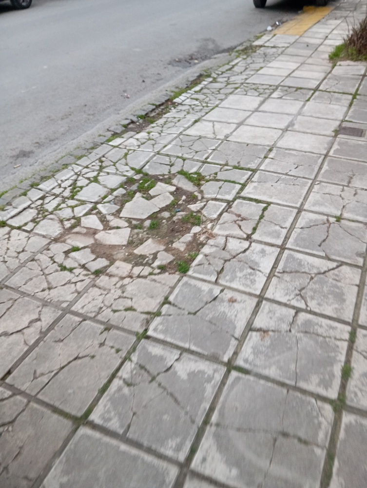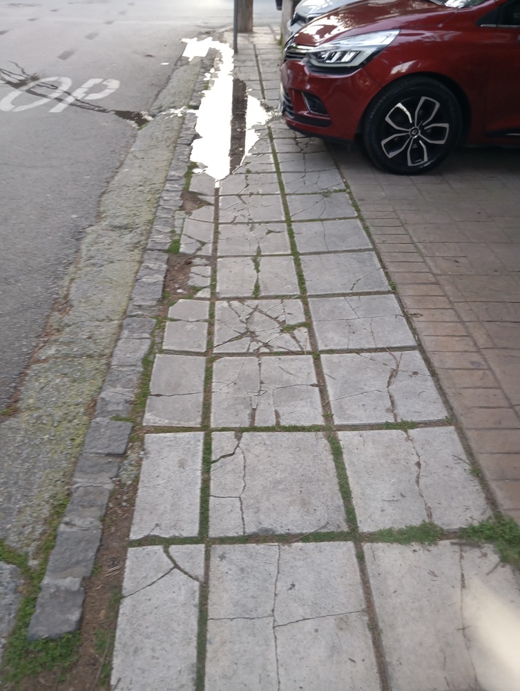 Αμισού 18 και Σουρμένων 29 γωνία οπως φαίνεται και στις φωτογραφίες οι πλάκες έχουν σπάσει και λιμνάζουν και νερά.