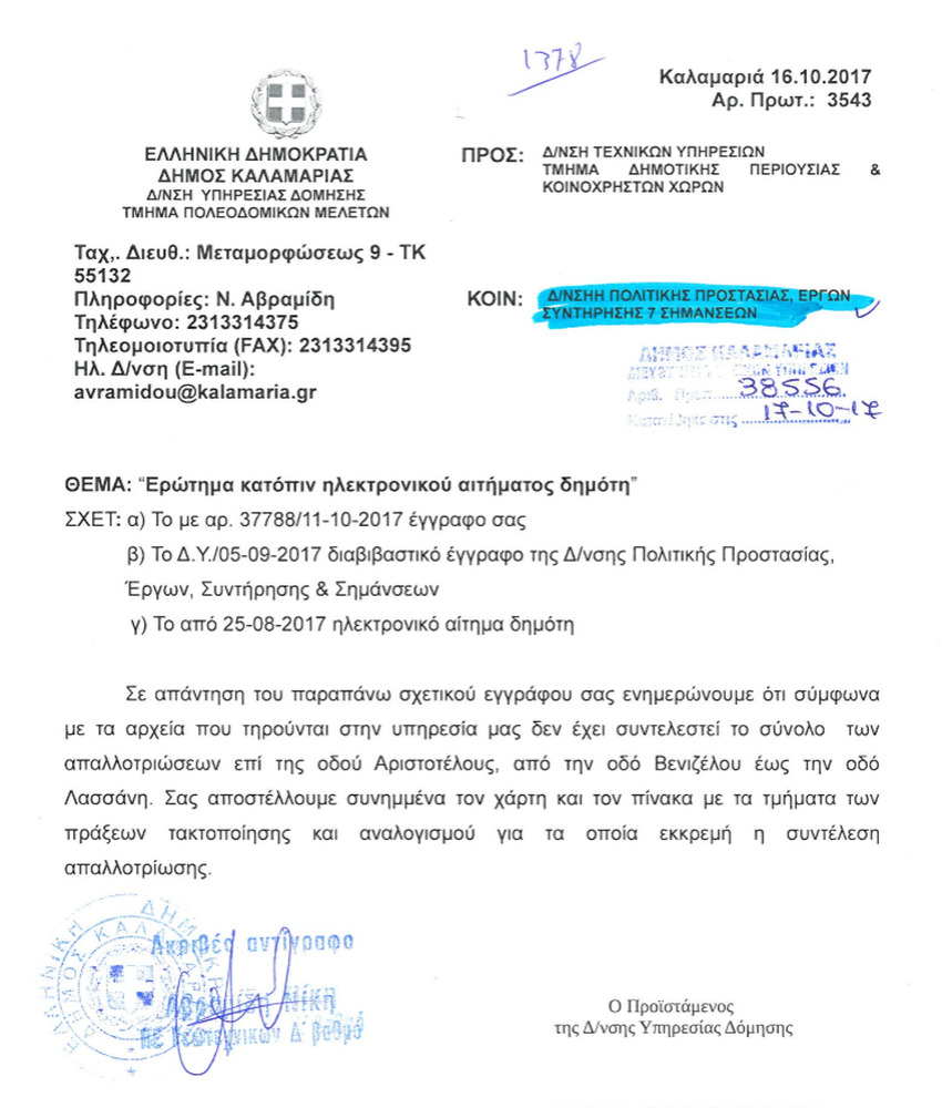 | Περιγραφή | Η οδός Αριστοτέλους, ένας δρόμος από τον οποίο περνάνε καθημερινά εκατοντάδες μαθητές που φοιτούν στο 11ο Δημοτικό Σχολείο Καλαμαριάς δεν έχει πεζοδρόμια από τη Λασσάνη έως και την Ελ. Βενιζέλου. Η ύπαρξη εγκαταλελειμμένων αυτοκινήτων στη συμβολή των οδών Αριστοτέλους και Ελ. Βενιζέλου επιτείνει το πρόβλημα, καθώς οι πεζοί αναγκάζονται να περπατούν στη μέση του δρόμου. Δεδομένου ότι τα αυτοκίνητα που εισέρχονται στην Αριστοτέλους από την Ελ. Βενιζέλου έχουν συχνά μεγάλη ταχύτητα, οι πεζοί διασχίζουν το συγκεκριμένο σημείο με κίνδυνο της ζωής τους. |