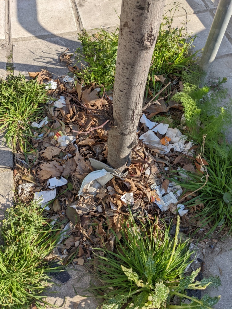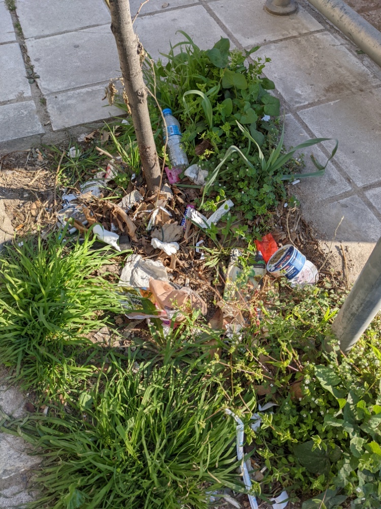 Στο έδαφος γύρω από τα δέντρα επί της οδού Βενιζέλου (από το νούμερο 7 και μέχρι την διασταύρωση με την οδό Αλικαρνασού συσσωρεύονται επί μήνες σκουπίδια. Επίσης τα δέντρα δεν έχουν κλαδευτει φέτος.
