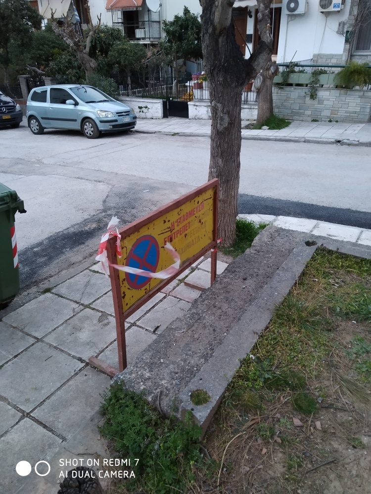 Ξεχασμένη ταμπέλα του δήμου, ύστερα από την ολοκλήρωση της επισκευής του δρόμου. Το έργο έχει ολοκληρωθεί εδώ και μία βδομάδα.