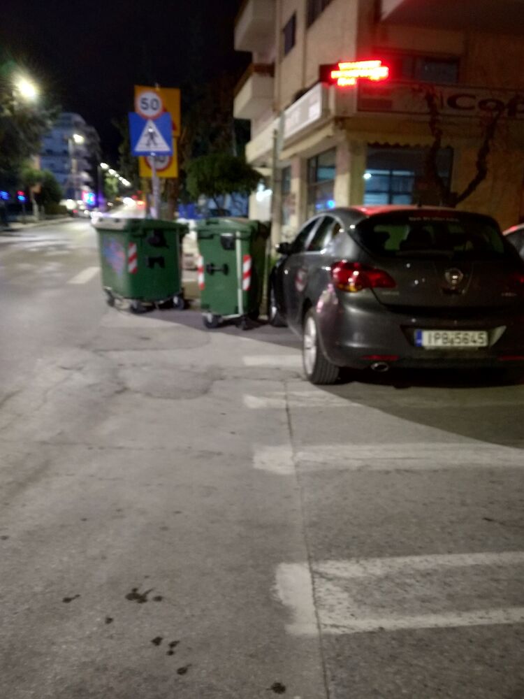 | Περιγραφή | Βρυούλων με Εφέσου γωνία. Οι φωτογραφίες τα λένε όλα. Δεν ξέρω ποιανού αρμοδιότητα είναι και τι μπορεί να γίνει για να αντιμετωπιστεί αυτό το πρόβλημα, θα σας παρακαλούσα όμως να το κοιτάξετε. Πέρα από την ασέβεια προς τους πεζούς, υπάρχει κίνδυνος ατυχήματος γιατί οι κάδοι και τα αυτοκίνητα εμποδίζουν την ορατότητα των διερχόμενων οχημάτων. |